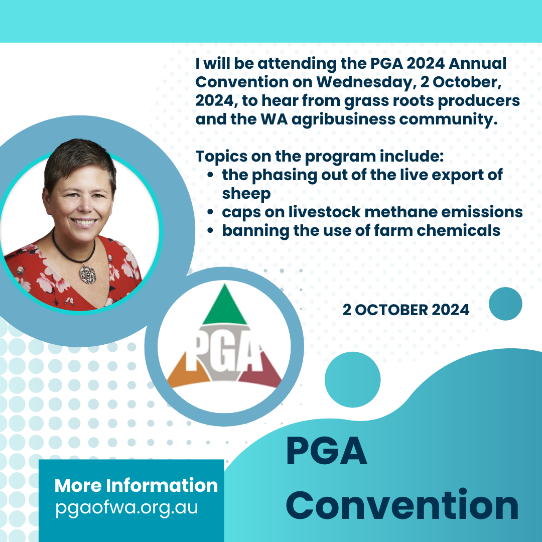I will be attending the PGA 2024 Annual Convention on Wednesday, 2 October, 2024, to hear from grass roots producers and the WA agribusiness community. Topics on the program include the phasing out of the live export of sheep, caps on livestock methane emissions, and banning the use of farm chemicals.